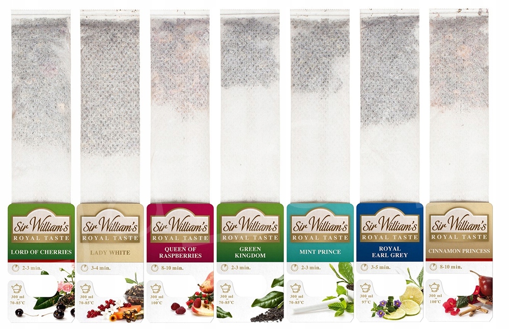 Obsah: Drevená škatuľka s ôsmimi oddeleniami 8 príchutí Sir Williams Royal Taste čaj 10 vreciek každého typu.