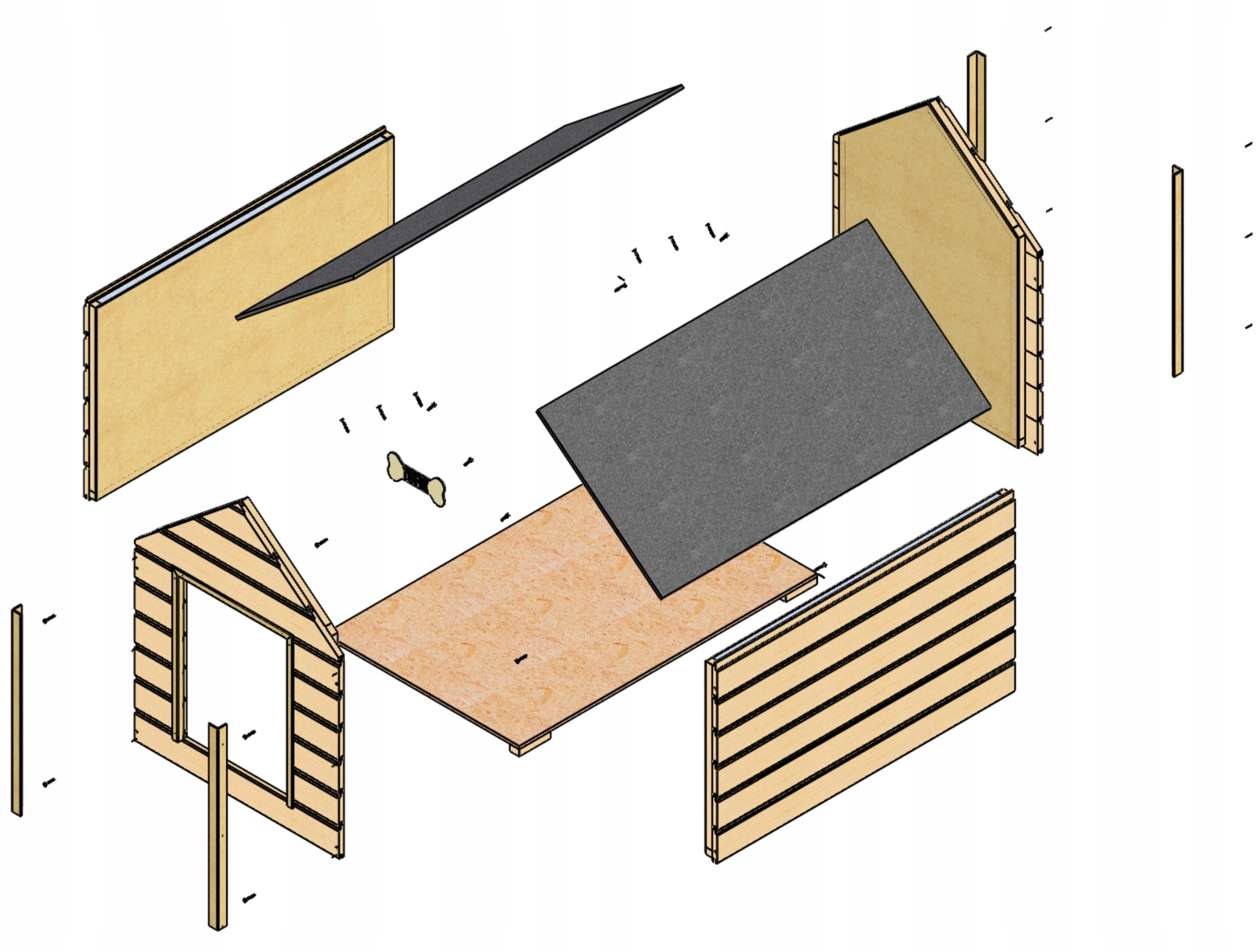 Budę składa się w bardzo prosty sposób, większość elementów jest już gotowa, jako prefabrykat, wystarczy je ze sobą skręcić. Wszelkie niezbędne akcesoria są już w zestawie (wkręty, gwoździe)