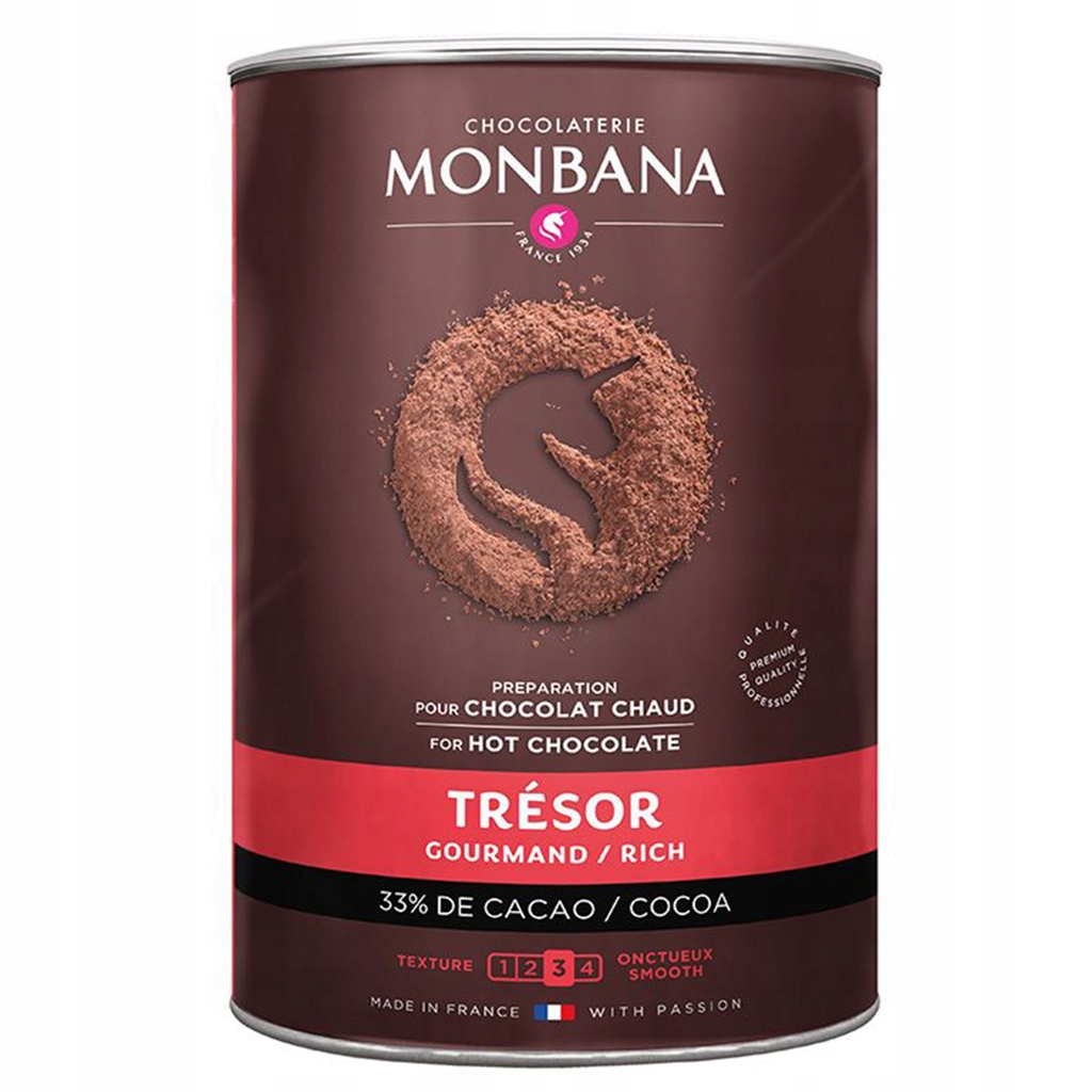Czekolada Monbana Tresor jest produkowana według tradycyjnych, sprawdzonych receptur. Zawiera 32% kakao, idealna do picia na gorąco. Po wymieszaniu z porcją gorącego mleka, tworzy czekoladowy napój. Jest gęsta dzięki zawartości skrobi pszennej. W opakowaniu znajduje się 1kg czekolady w proszku.