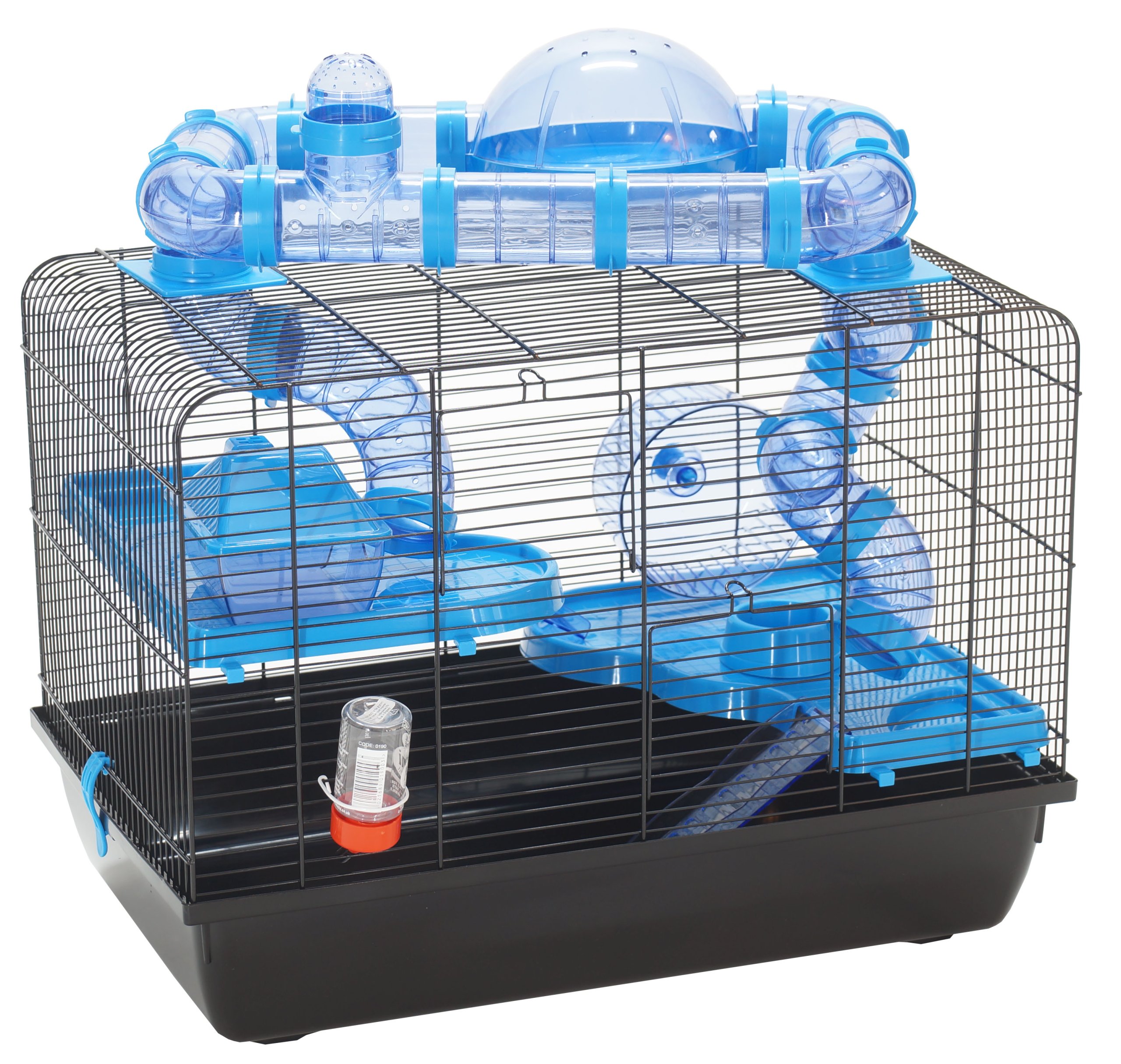 Spodná časť klietky je pevná, plastová, horná časť je vyrobená z čierneho drôteného pletiva.