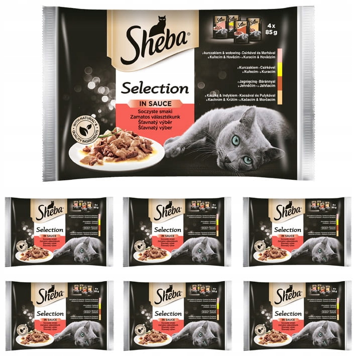 Mokra karma dla kota Sheba® Selection in Sauce Soczyste Smaki to zestaw saszetek o smaku wołowiny, jagnięciny, kurczaka i indyka, zawierających luksusowe mieszanki najwyższej jakości kawałków karmy w delikatnym sosie. Ich pyszna receptura sprawia, że Twój koci przyjaciel będzie prosił o więcej. Sheba® Selection in Sauce Soczyste Smaki to karmy pełnoporcjowe, które dostarczą Twojemu kotu niezbędnych składników odżywczych. Dostępne w wygodnych saszetkach.