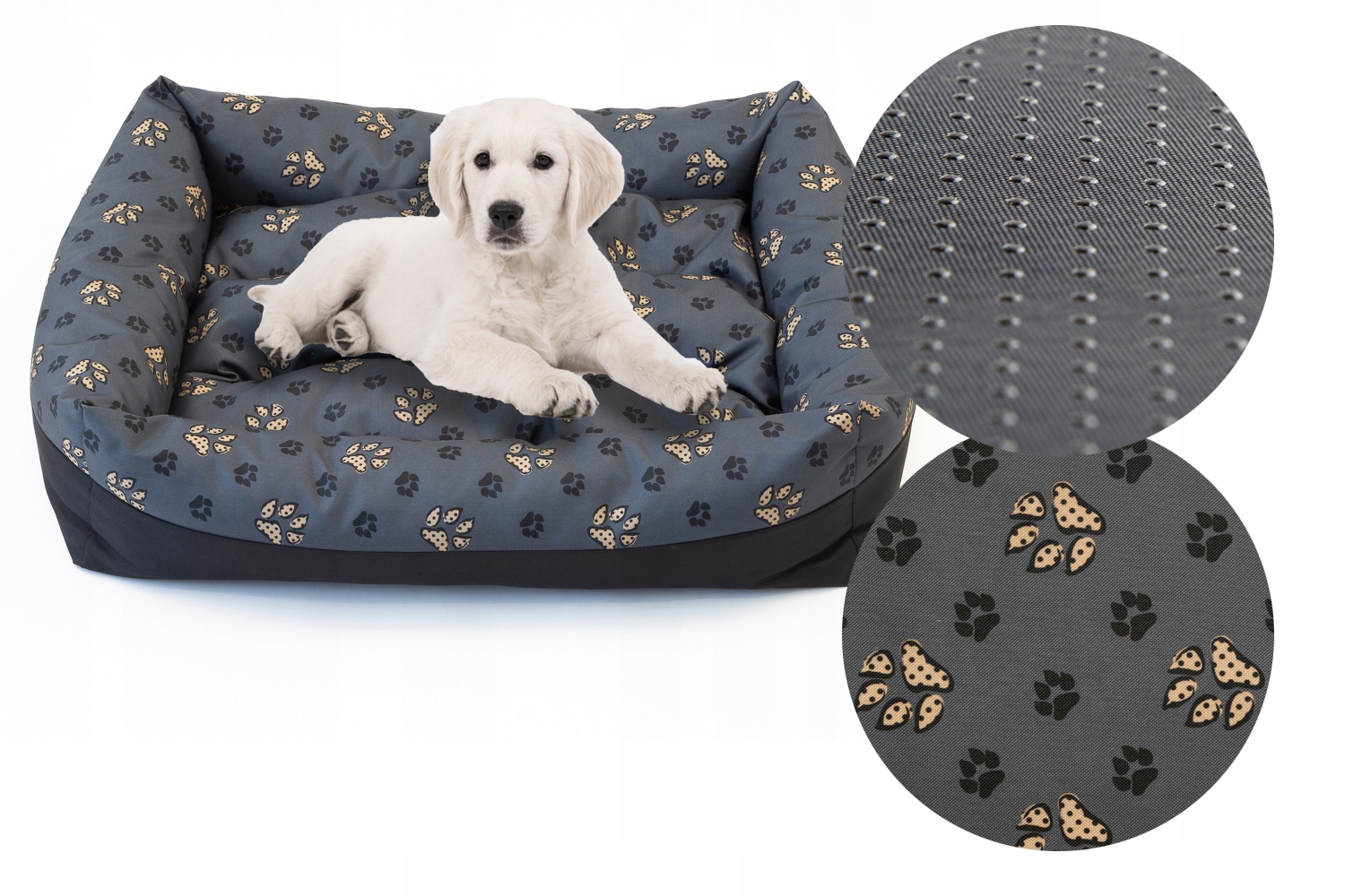 - Środek i boki legowiska zostały w całości wykonane z materiału wodoodpornego typu pasadena, a nie łączone z cienkim wigofilem, co daje większą estetykę i funkcjonalność produktu.