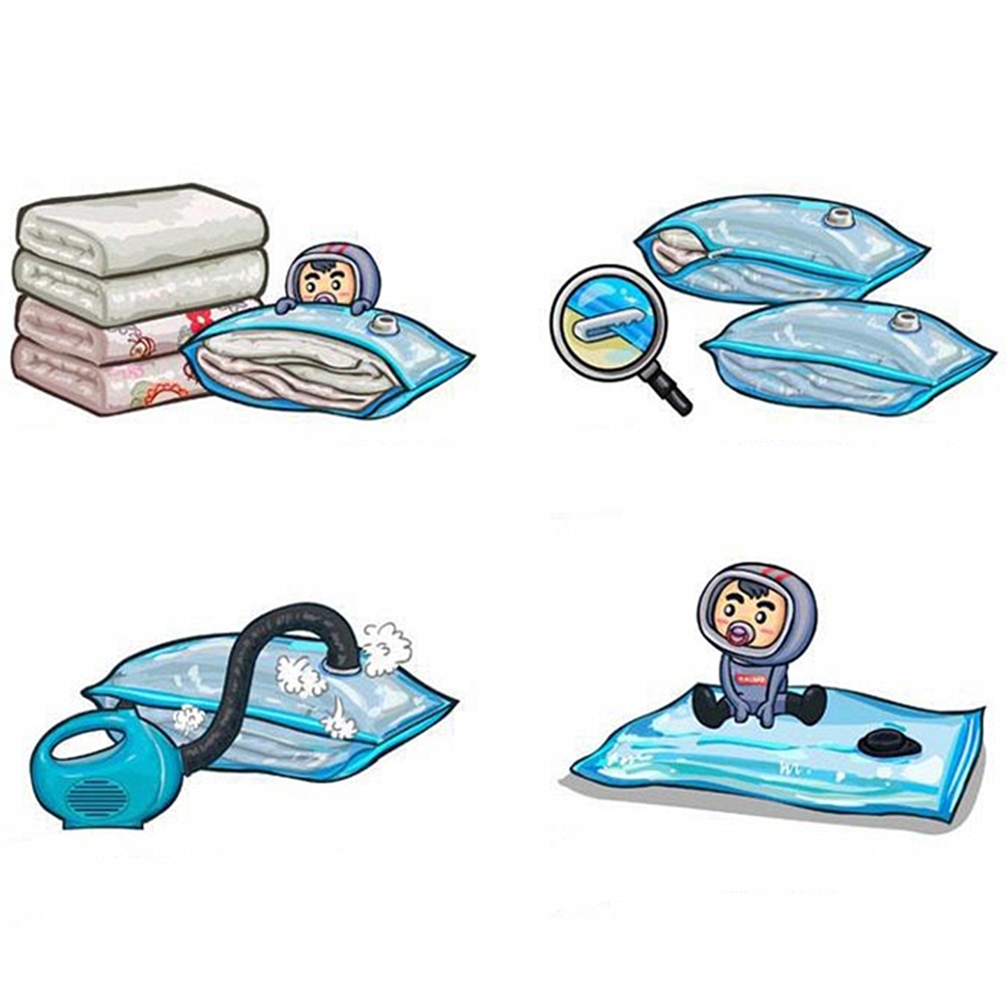 Napríklad vložte do tašky oblečenie a potom ho pevne uzavrite pomocou špeciálne pripevneného jazdca (spony). Pre istotu opravte lanko pomocou prstov. Potom pomocou vysávača nasávame vzduch a potom uzáver uzavrite.
