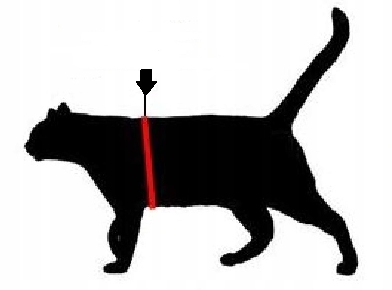 4. Wymiar kota mierzony w centymetrach powinien zawierać się w dolnej granicy rozmiarówki (np. jeśli kot ma w obwodzie 35 cm to najlepiej wybrać rozmiar 2 czyli 34-44 cm)