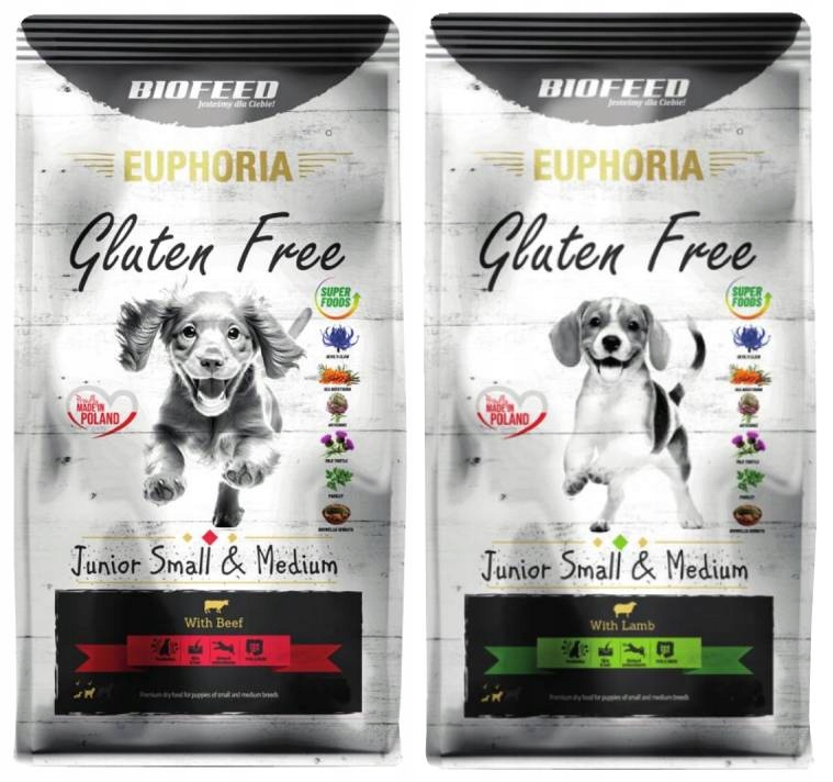 Karma dla szczeniaka BioFeed EUPHORIA Junior z wołowiną. Dedykowana psom małych i średnich ras. Pełnoporcjowa karma bezglutenowa z dodatkiem kwasów Omega 3 i 6 oraz witamin.
