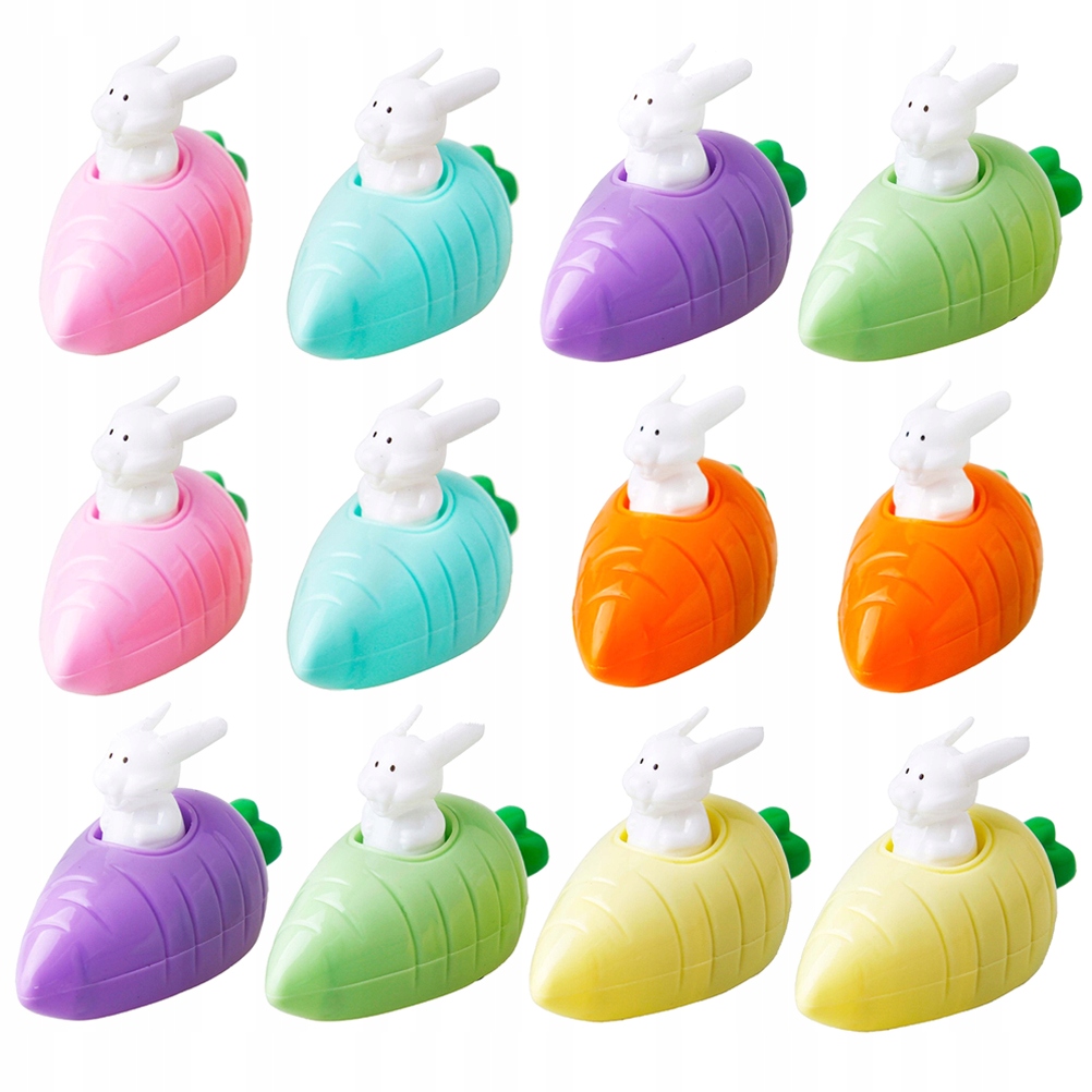 Wózki zabawkowe mają kształt marchewki z siedzącym na nich królikiem. Wygląda na to, że królik prowadzi, co jest urocze i zabawne, idealne na imprezy o tematyce wielkanocnej.