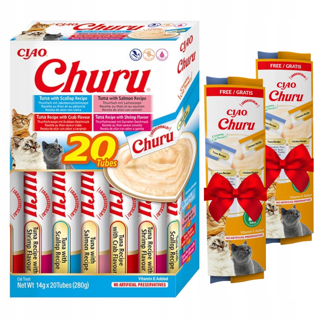 INABA CAT CHURU Przysmaków dla KOTA z tuńczykiem i owocami morza 20x14g + GRATIS 2 x INABA CAT CHURU SNACK PUREE (2x14g)