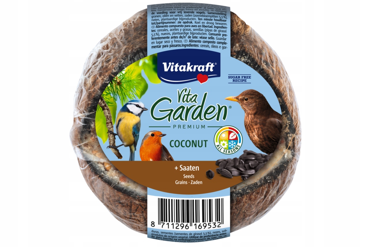Karma uzupełniająca dla ptaków ogrodowych. Kokosy VITA GARDEN ® są bogate w niezbędne tłuszcze, zboża oraz smaczne nasiona i dodatki. To cenne uzupełnienie diety wolno żyjących ptaków ogrodowych przez cały rok. Receptura bez cukru. Nie zawiera sztucznych barwników i konserwantów.
