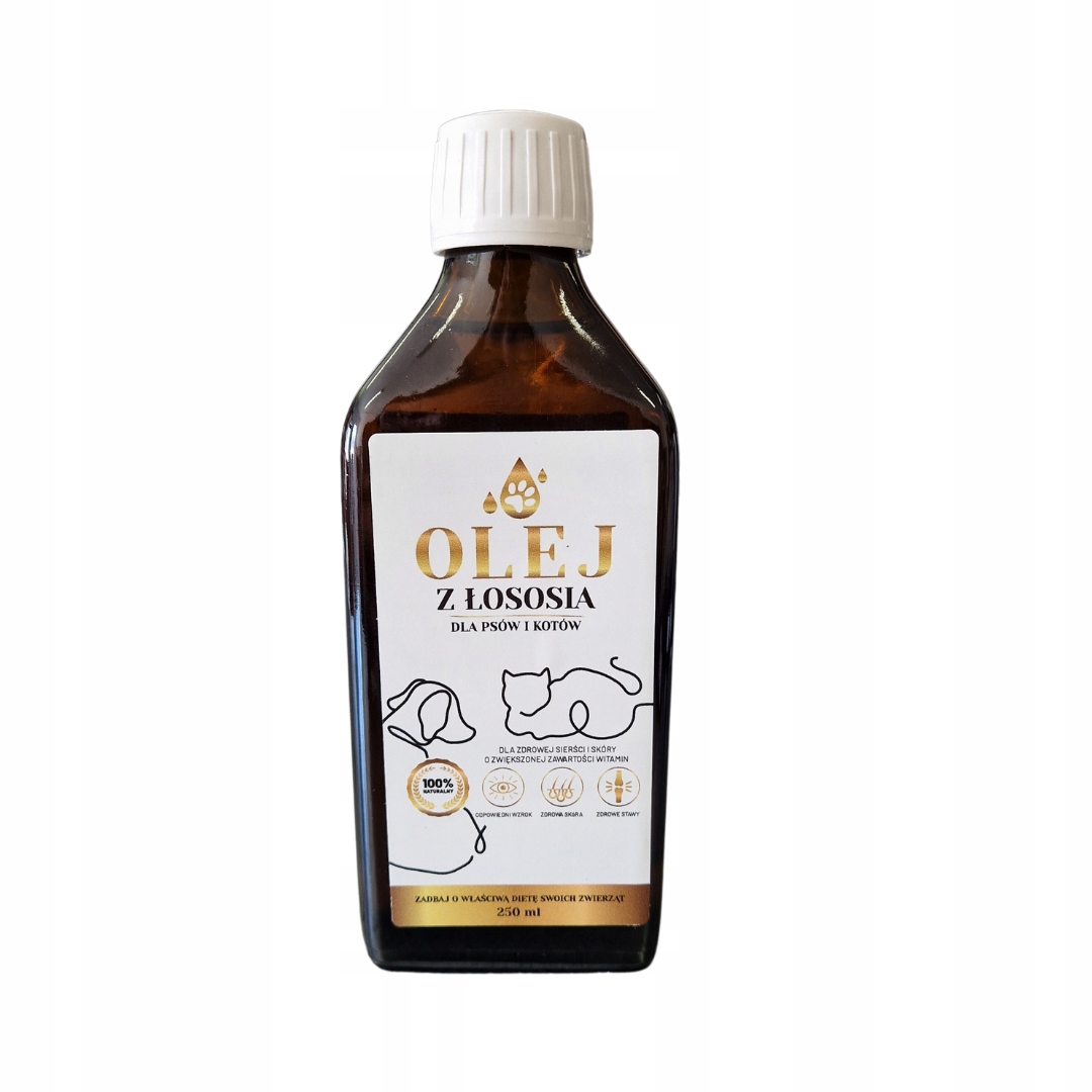 - Olej z łososia to naturalny suplement diety dla psów i kotów w każdym wieku.