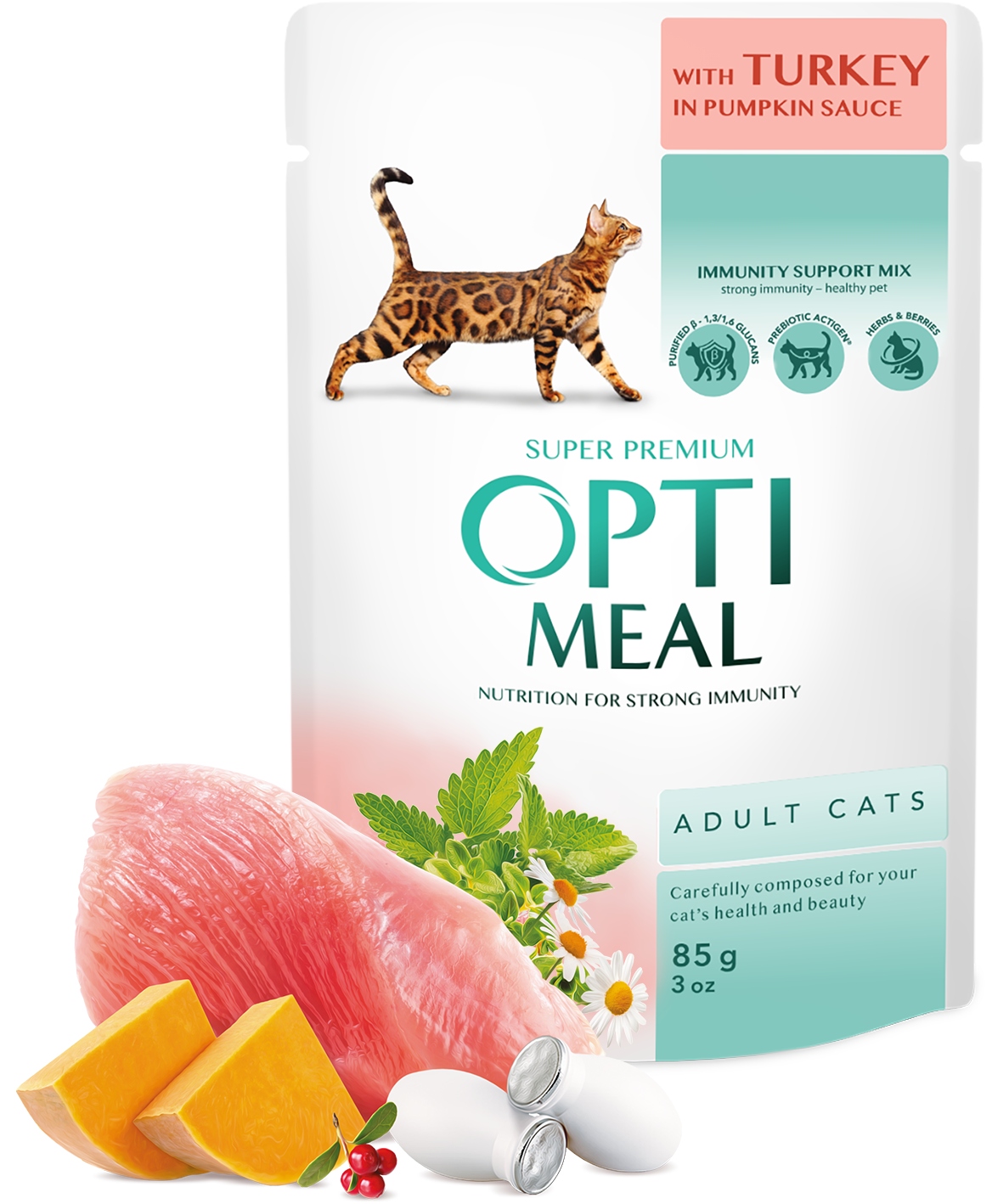 OptiMeal to karma Super Premium dla kotów i psów, ❤️ stworzona pod nadzorem lekarzy weterynarii. Jej wyjątkowa receptura skupia się na zdrowiu i urodzie zwierzęcia poprzez starannie wyselekcjonowane składniki mięsne, naturalne przeciwutleniacze, prebiotyki, jagody oraz przydatne zioła. Te składniki wspólnie tworzą dodatkową naturalną ochronę, wzmacniając odporność kota lub psa.