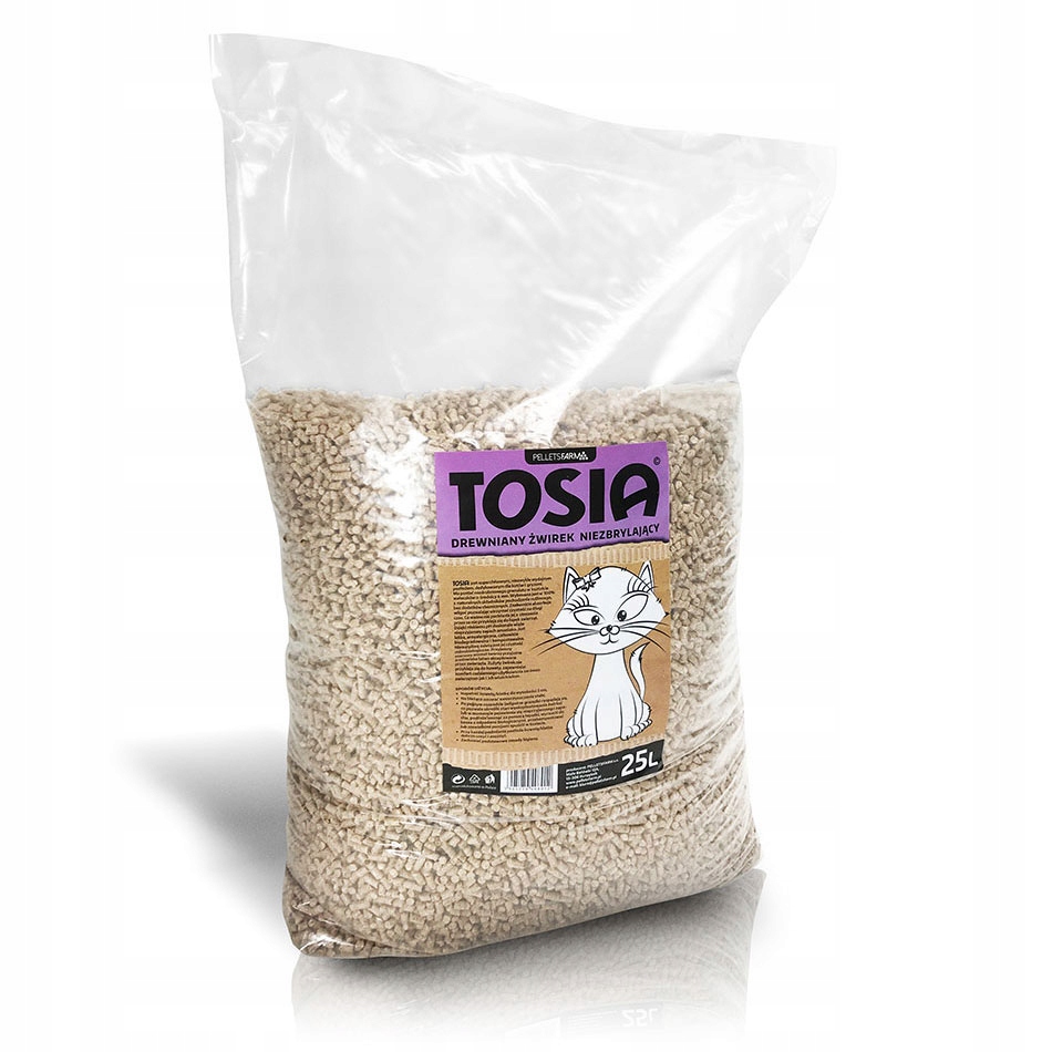TOSIA to superchłonny żwirek zoologiczny Ma postać rozdrobnionego granulatu w kształcie wałeczków o średnicy 4 mm. Wykonana jest w 100% z naturalnych składników pochodzenia roślinnego, bez dodatków chemicznych. Znakomicie absorbuje wilgoć pozwalając utrzymać czystość na długi czas. Co ważne nie pochłania jej z otoczenia przez co nie przykleja się do łapek zwierząt. Dzięki niskiemu pH doskonale wiąże nieprzyjemny zapach amoniaku. Żwirek zoologiczny TOSIA jest antyalergiczny, całkowicie biodegradowalny i kompostowalny. Niewątpliwą zaletą jest jego czystość mikrobiologiczna. Przyjemny sosnowy aromat tworzy przyjazne środowisko łatwo akceptowane przez zwierzęta. Zużyty żwirek nie przykleja się do kuwety, zapewniając komfort codziennego użytkowania zarówno zwierzętom jak i ich właścicielom. Kolor produktu może się różnić w okresie wiosenno-letnim i jesienno-zimowym ze względu na konieczność suszenia materiału, co powoduje przyciemnienie produktu.
