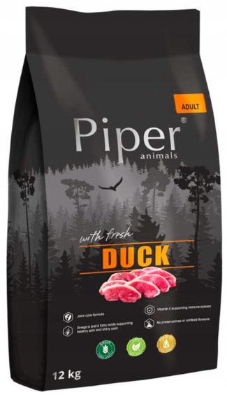 PIPER ANIMALS z kaczką jest pełnoporcjową karmą przeznaczoną do żywienia dorosłych psów. Wysoką zawartość niezbędnego białka oraz kwasów tłuszczowych z grupy n-6 zapewnia użycie w procesie produkcji surowców pochodzenia zwierzęcego, w tym świeżej kaczki. Odpowiednia zawartość wapnia wpływa na prawidłowe funkcjonowanie układu kostnego.