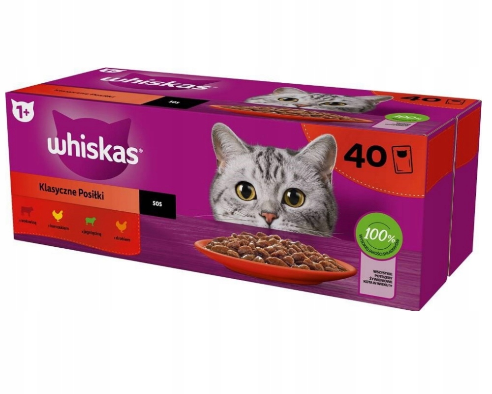 Karma mokra w saszetkach Whiskas Klasyczne Posiłki w sosie zostały specjalnie przygotowane tak, aby zachować naturalne zalety i smak wysokiej jakości składników. Sprawią, że Twój kot przybiegnie do miski szybciej niż kiedykolwiek wcześniej! Koci przyjaciel rozsmakuje się w jednym z czterech wariantów, kawałki z: wołowiną, kurczakiem, jagnięciną, drobiem. Ten smaczny pokarm w wygodnej saszetce zawiera cynk, który wspiera zdrowie skóry i sierści, a odpowiedni bilans minerałów pomaga zadbać o kondycję dróg moczowych Twojego pupila. Od figlarnego kocięcia po wspaniałego dorosłego kota – nasze smakowite receptury zostały opracowane z myślą o tym, aby kot w każdym wieku mruczał z zadowolenia w porze posiłku i nie tylko.