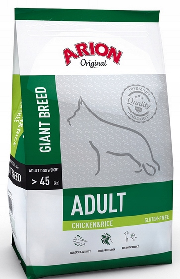 Arion Original Adult Giant – bezglutenowa karma dla psów dorosłych, ras olbrzymich, z kurczakiem. Opracowana specjalnie, aby zapewnić zdrowy rozwój mięśni, kości i stawów, tak by zagwarantować komfort życia psa dużej rasy. Zawiera glukozaminę i chondroitynę, by zbudować i wzmocnić chrząstkę stawową tak, by zapewnić ruchomość stawów u psów dużych ras. Zawiera naturalnie fermentujące włókna FOS i MOS, by zapewnić zrównoważoną florę bakteryjną w jelitach i zagwarantować optymalny przebieg trawienia.
