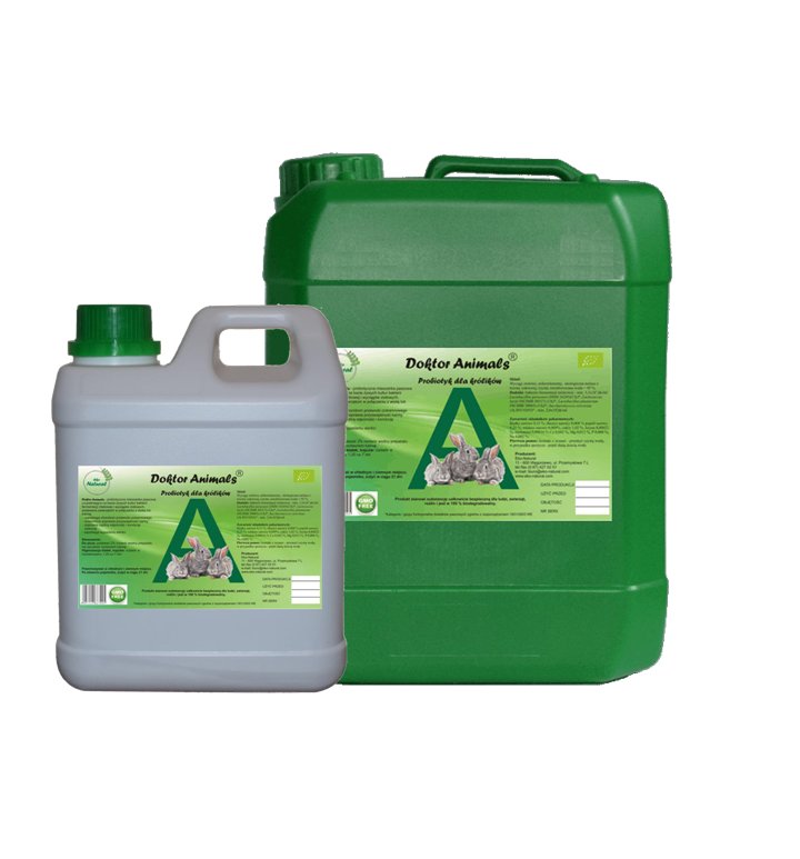 Probiotyk dla królików Doktor Animals - probiotyczna mieszanka paszowa uzupełniająca (MPU) w płynie na bazie żywych kultur bakterii fermentacji mlekowej i ziół.